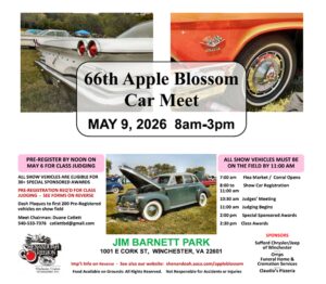 The 66th Annual Apple Blossom Meet will be held on Saturday, May 9, 2026 at Jim Barnett Park in Winchester, VA. In addition to class judging, we will have dozens of Special Awards available. There are flea market vendors and food available onsite.